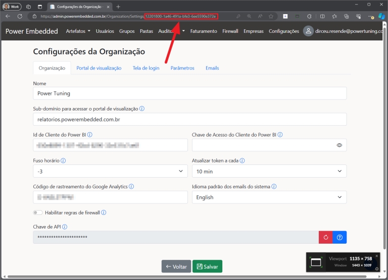 O ID da organização (ID fixo para cliente do Power Embedded – Está na URL da tela de configurações – Ex: 12201800-1a46-491a-bfe3-6ee5590e372e)