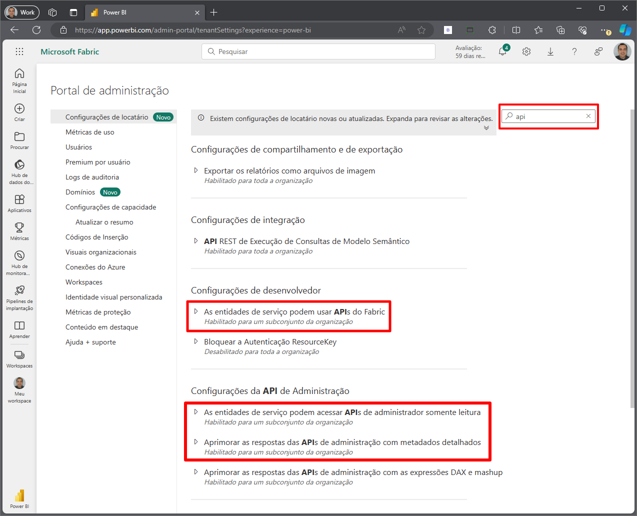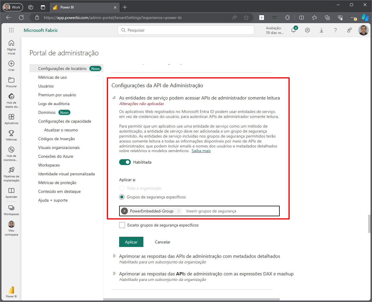 Atualize a página e agora a opção “Aprimorar as respostas das APIs de administração com as expressões DAX e mashup” vai ficar disponível para ser marcada. Repita o mesmo processo para essa permissão.
