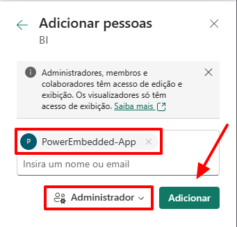 Pesquise pelo nome do aplicativo que foi criado anteriormente (PowerEmbedded-App) e lembre de alterar o nível de acesso para “Administrador”. Após isso, clique no botão “Add”