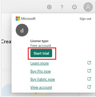 Para ativar o período de avaliação do Fabric, clique na sua foto no menu do Power B