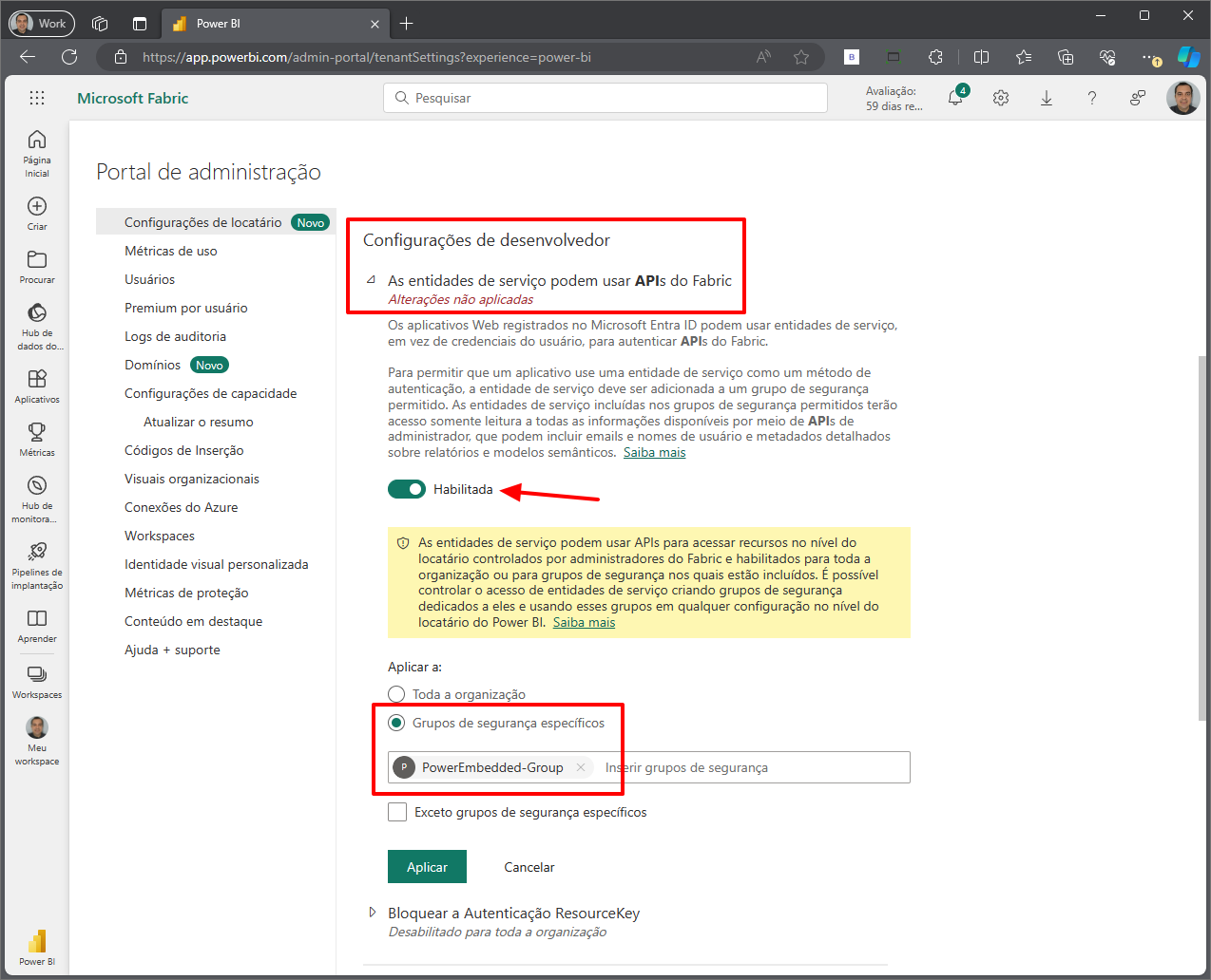Marque a opção “As entidades de serviço podem usar APIs do Fabric”.