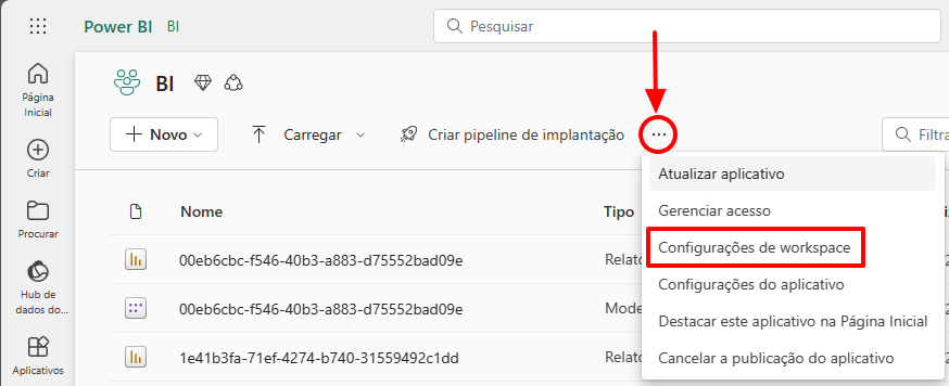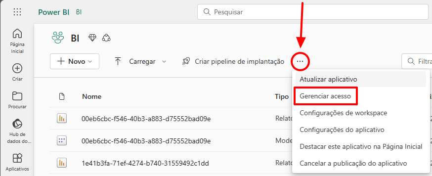 Para adicionar o Service Principal criado como administrador de um workspace, acesse o workspace, clique nos 3 pontinhos e selecione a opção “Gerenciar acesso