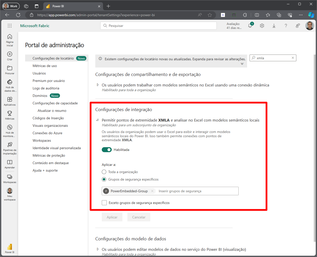 E por último, na seção “Configurações de integração”, faça o mesmo processo para a configuração “Permitir pontos de extremidade XMLA e analisar no Excel com modelos semânticos locais”, que serve para permitir a listagem das roles de RLS de forma automática.