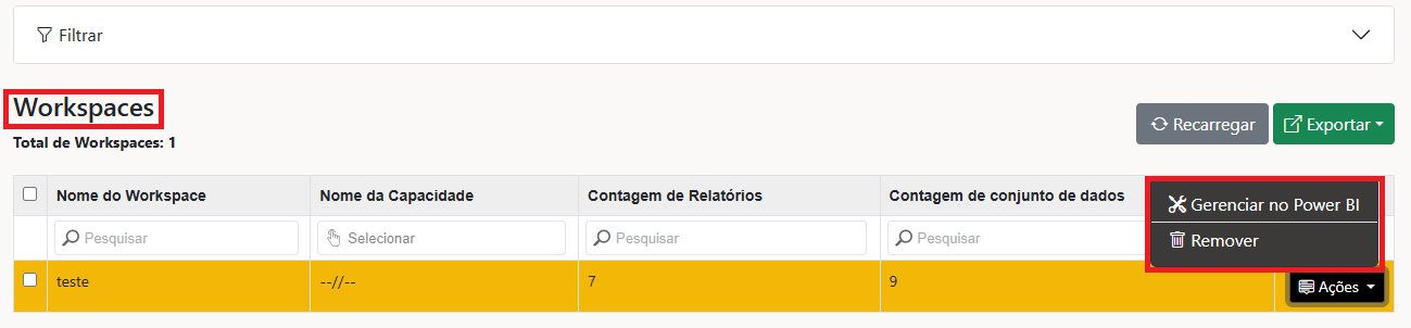 Neste menu, é possível visualizar os workspaces vinculados ao portal do Power Embedded. Este ambiente é mais uma visão de auditoria, sem possibilidade de realizar ações diretas.