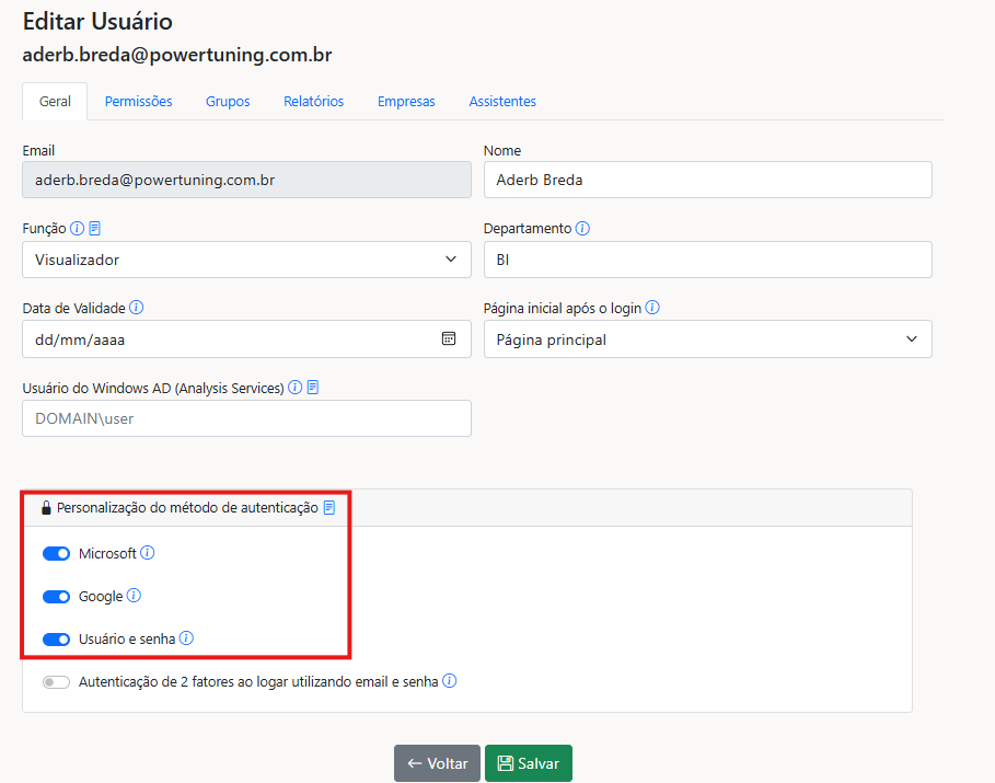 * Caso o método de autenticação esteja permitido na tela de Configurações, o sistema então verifica se o usuário pode utilizar o método de autenticação escolhido, validando essa propriedade no cadastro do usuário ou se o usuário faz parte de algum grupo que tenha essa permissão habilitada.