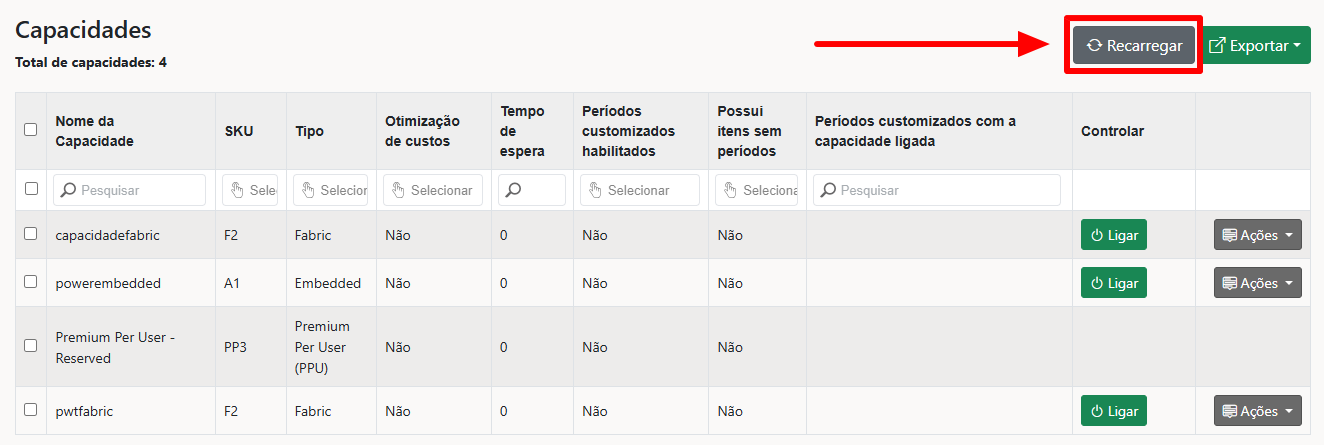 Caso não esteja, clique no botão **Recarregar** para atualizar a lista de capacidade&#x73;**.**
