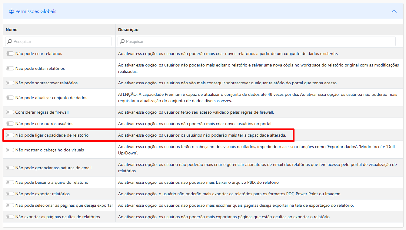 * Se um usuário sem a permissão de ativar a capacidade automaticamente tentar acessar um relatório enquanto a capacidade estiver desligada, ele não conseguirá visualizar o relatório.\\
