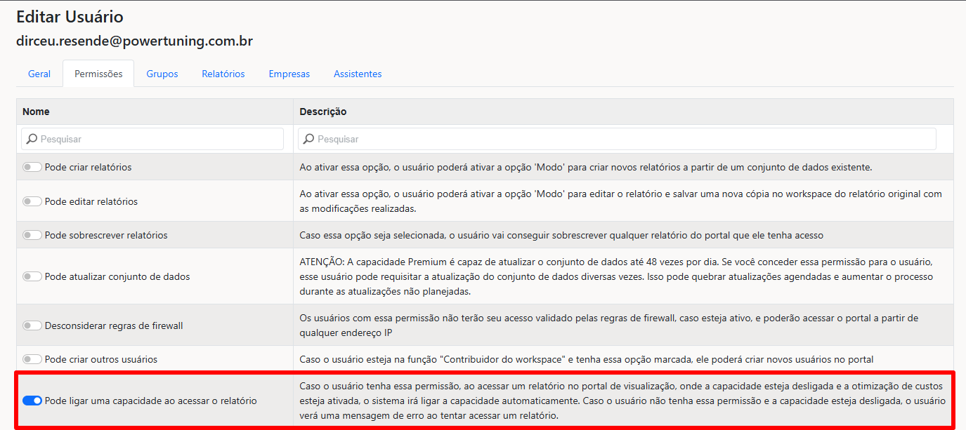 Verifique os grupos que esse usuário está e acesse a [página de Grupos](https://admin.powerembedded.com.br/Groups) para verificar se algum dos grupos tem essa permissão de ligar a capacidade e também tem acesso à esse relatório.