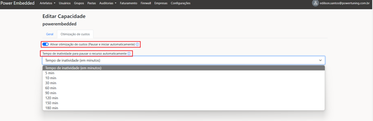 * Você pode definir o período de minutos durante o qual sua capacidade pode permanecer inativa (ou seja, sem relatórios abertos). Quando o sistema detecta que nenhum relatório foi acessado durante esse período, a capacidade é automaticamente pausada.
