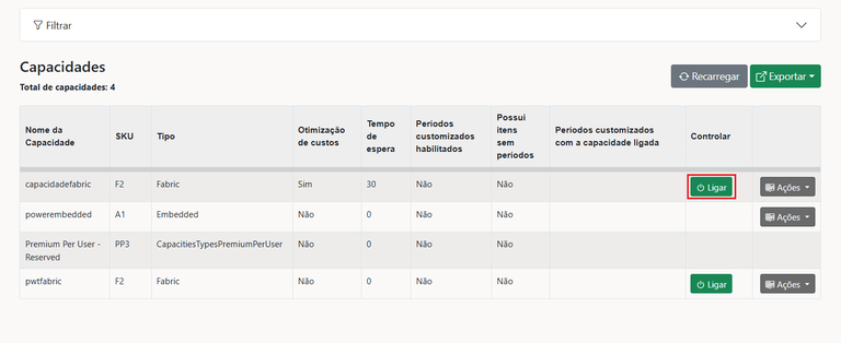 Após concluir o processo anterior, é importante acessar a página de [**Workspaces**](https://admin.powerembedded.com.br/Workspaces) e clicar no botão **Recarregar** para confirmar que o workspace agora está associado à capacidade correta.