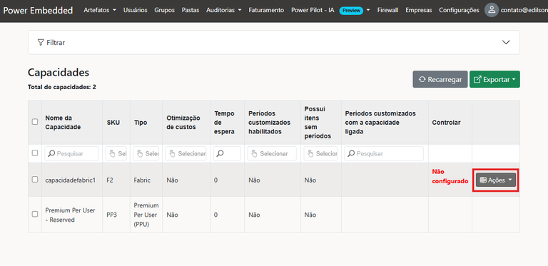 Acesse a [página de Capacidades](https://admin.powerembedded.com.br/Capacities) e verifique se a capacidade contratada aparece na lista.