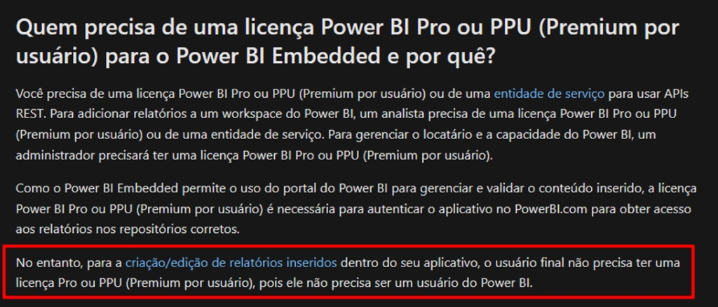 Falando sobre o licenciamento por capacidade, no link abaixo, a Microsoft deixa bem claro que os usuários que estão vendo o conteúdo publicado no Power BI Embedded não precisam de licenças do Power BI atribuídas a eles, portanto, não é necessária uma licença PRO para visualização dos relatórios através do Power Embedded