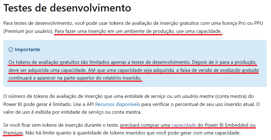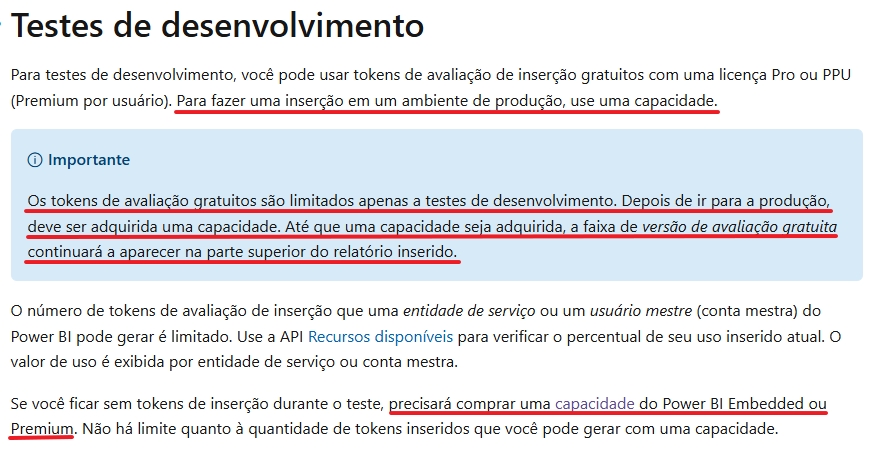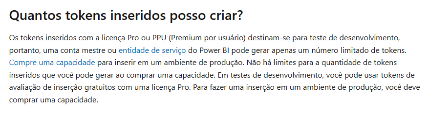 “Os tokens inseridos com a licença Pro ou PPU (Premium por usuário) destinam-se para teste de desenvolvimento, portanto, uma conta mestre ou entidade de serviço do Power BI pode gerar apenas um número limitado de tokens. Compre uma capacidade para inserir em um ambiente de produção. Não há limites para a quantidade de tokens inseridos que você pode gerar ao comprar uma capacidade. Em testes de desenvolvimento, você pode usar tokens de avaliação de inserção gratuitos com uma licença Pro. Para fazer uma inserção em um ambiente de produção, você deve comprar uma capacidade."