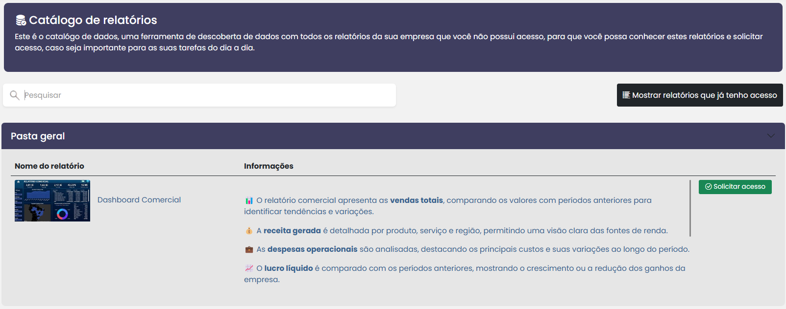 A funcionalidade de catálogo de relatórios permite que você compartilhe com todos os seus usuários a existência de determinados relatórios, mesmo que eles não tenham acesso ao relatório.